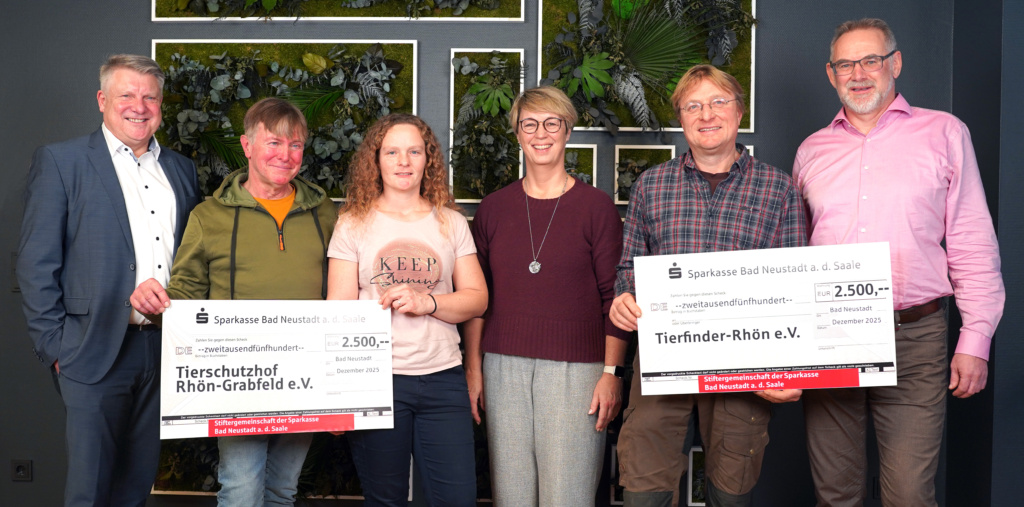 Die Stiftergemeinschaft der Sparkasse Bad Neustadt a. d. Saale unterstützt auch in diesem Jahr den regionalen Tierschutz. Der Tierschutzhof Rhön-Grabfeld e. V. sowie die Tierfinder Rhön e. V. wurden jeweils mit 2.500 Euro gefördert.